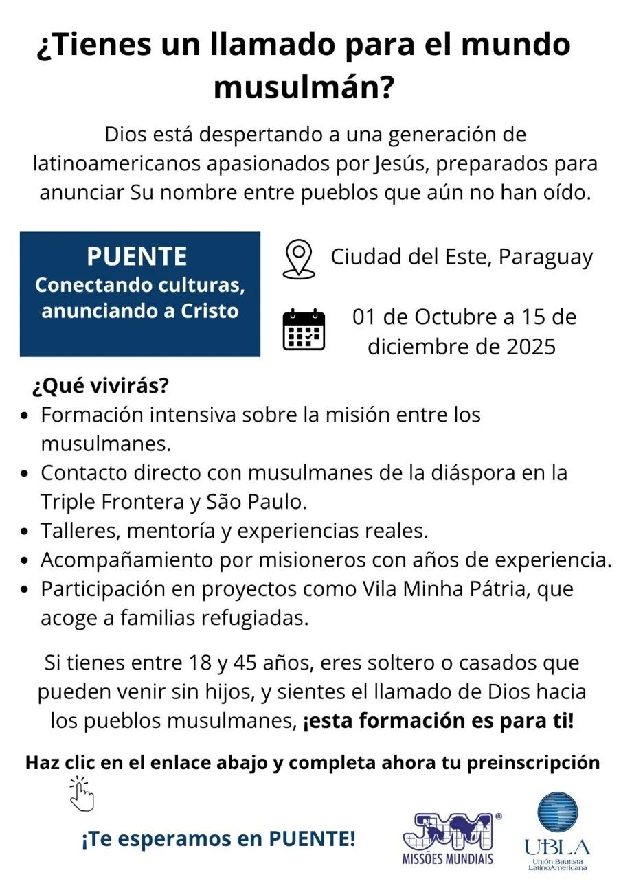 PUENTE: Entrenamiento para quienes desean servir entre musulmanes Wednesday, October 1, 2025 6:30 AM Monday, December 15, 2025 7:30 AM Ciudad del Este Ciudad del Este, Alto Paraná Department Paraguay (map) Google Calendar ICS Preinscripción