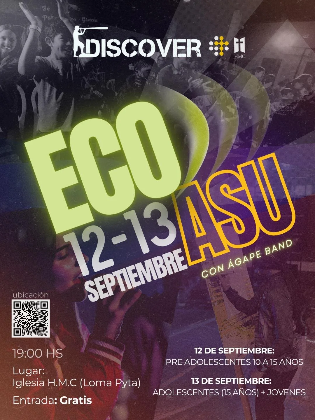 ECO ASU Friday, September 12, 2025 6:00 AM Saturday, September 13, 2025 6:00 AM Concordia Loma Pytá - HMC Asunción, Asunción, 001506 Paraguay (map) Google Calendar ICS ECO ASU es un evento para pre adolescentes y adolescentes donde habrá momentos de conexión, juegos, mensajes y alabanza los días 12 y 13 de septiembre en la Iglesia Concordia Loma Pyta. Organiza: Asociación Discover Más información