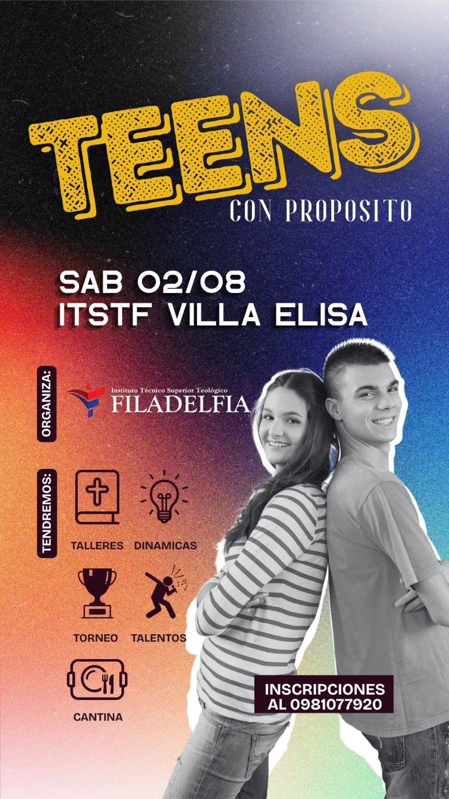 Back to All Events Congreso Juvenil "TEENS con Propósito" Saturday, August 2, 2025 8:00 AM 7:00 PM ITSTF - Instituto Superior Teológico Filadelfia Villa Elisa, Central Department, 111503 Paraguay (map) Google Calendar ICS Más información